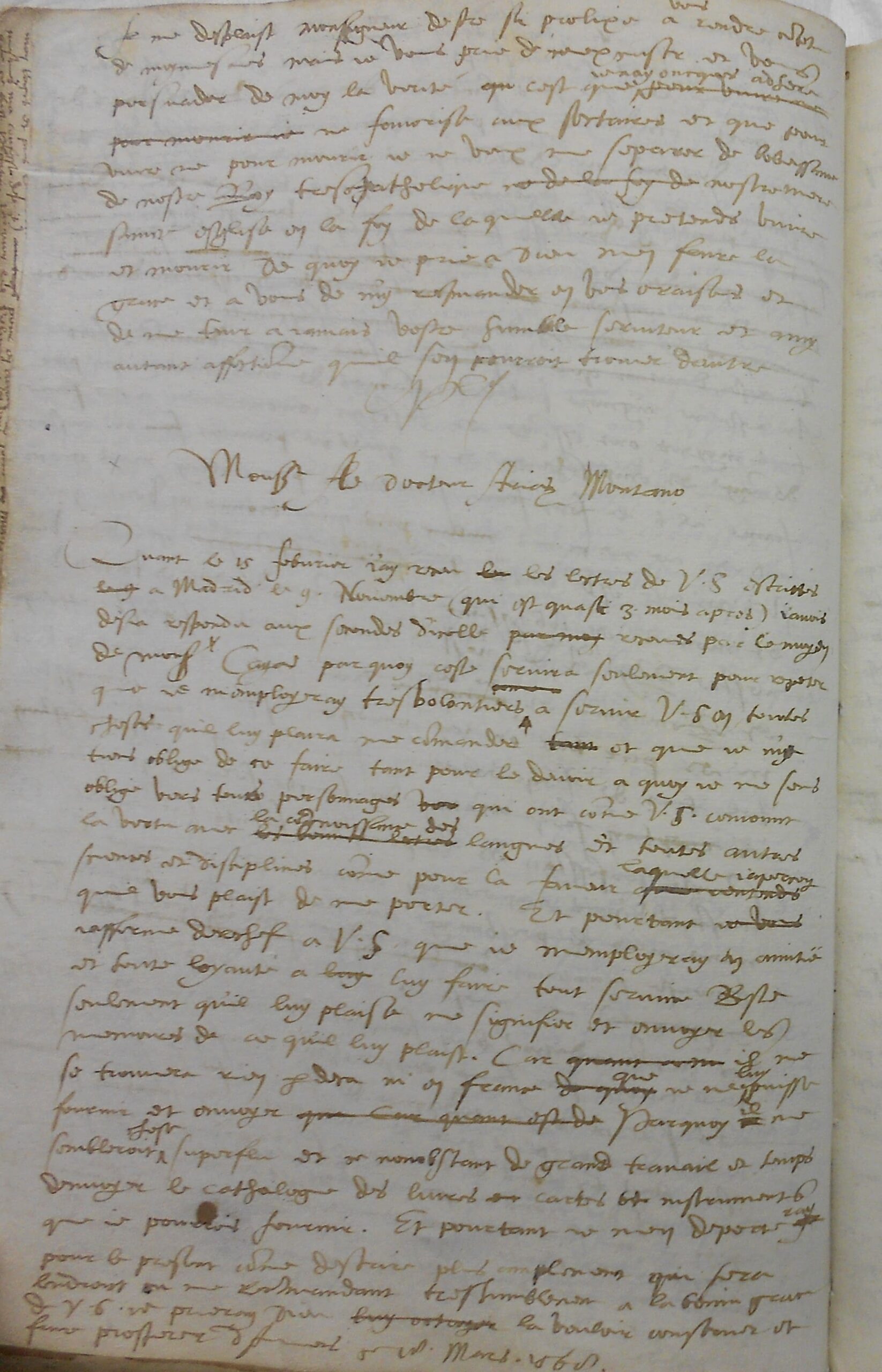 [1] Quant le 15 febvrier i’ay receu le les lectres1 de Vostre Signeurie escrittes le 9 a Madrid le 9 Novembre (qui est quasi 3 mois apres), i’avois desja respondu aux secondes d’icelles pour moy receues par le moyen de Monsigneur Cayas;2 par quoy ceste servira seulement pour repeter que ie m’employeray tres volontiers comme a a servir Vostre Signeurie en toutes choses quil luy plaira me commander tant et que ie m’y tiens oblige de ce faire, tant pour le devoir a quoy ie me sens oblige vers toutes personnages uer qui ont, comme Vostre Signeurie, conioinct la vertu avec les bonnes lectres la congnoissance3 des langues et toutes autres sciences et disciplines, comme pour la faveur que i’entends laquelle i’apercoy4 qu’il vous plaist de me porter. [2] Et pourtant ie vous i’affirme derechef5 a Vostre Signeurie que ie m’employeray en amitie et toute loyaute a luy luy faire tout service.