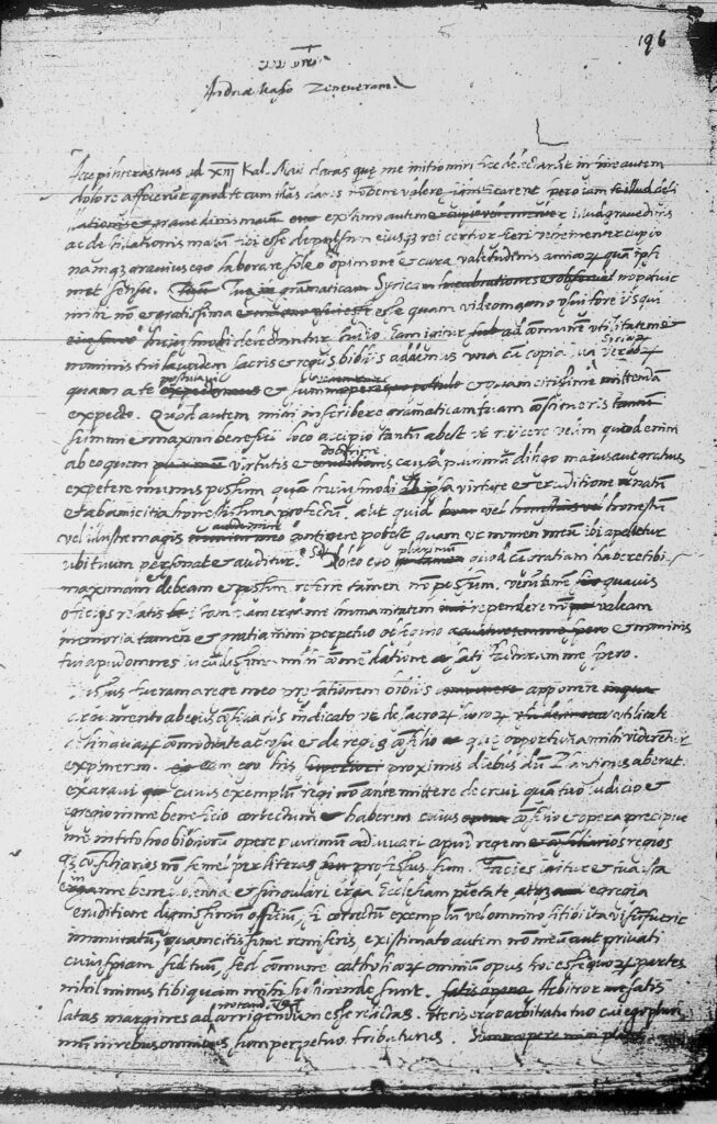 [6] Iussus fueram a rege meo praefationem Bibliis componere apponere inqua argumento ab eius consiliariis indicato, ut de Sacrorum Librorum usu de linguarum utilitate, de linguarum commoditate ac usu et de regis consilio quae opportuna mihi uiderentur exponerem. ego Eam ego his superiori proximis diebus, dum Plantinus aberat, exaraui qui, cuius exemplum regi non ante mittere decreui quam tuo iudicio et egregio in me beneficio correctum haberem; cuius opera consilio et opera precipue me in toto hoc Bibliorum opere plurimum adiuuari apud regem et consiliarios regiosque consiliarios non semel per literas sum professus sum. [7] Facies igitur et tua ista ergain me beneuolentia et singulari erga Ecclesiam pietate atque . egregia eruditione dignissimum officium, si correctum exemplum uel omnino, si tibi ita uisum fuerit, immutatum quam citissime remiseris. Existimato autem non meum aut priuati cuiuspiam, sed tuum, sed commune catholicorum omnium opus hoc esse, quorum partes nihil minus tibi quam mihi sustinendae sunt. [8] satis apono Arbitror satis latas margines ad notandum et corrigendum esse relictas. Vteris ergo arbitratu tuo, cui ego plurimum in rebus omnibus sum perpetuo tributurus. summopere mihi placet [f. 196v]