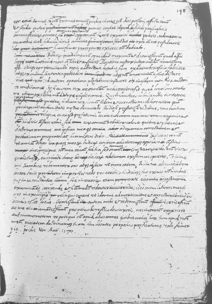 [2] Iam ut arbitror Bibliorum quadrilinguium opus illud maximum et dignissimum quod a Philippoi rege catholicoi regesregis consilio et auspiciis Plantino nostro imprimendum commissum est cuique ego procurando regis auctoritate legatus sum ex diuino beneficio foeliciter atque ex animi sententia procedere iam scias atque non longe nimium a fine distare scias ueli uolo. Id autem oportuna praefatione instruere ex eiusdem catholici regis auctoritate meditamur. Ipse autem rex argumentum nobis prescripsit, quod longiore oratione etiam ex illius mandato persequeremur. Quoniam uero nihil a nobis in toto opere . est exigebatur praeter summam uersionum fidem et correctionis diligentiam, quam pro ingenii ac facultatis nostrae tenuitate studiose praestitisse uidemur, una tantum reliqua cura est praefationis, cuius rationem non meo unius ingenio aut con iudicio constare uolui, sed omn eorum omnium arbitrio et calculo quibus et pietatis et doctrinae nomine me ipsum meaque omnia ad examen, correctionem et probationem proponere ac1 summittere debeo. [3] His autem . Ex quibus te unum ut amicum diligo ita quoque meorum studiorum censorem adiutoremque appellare constitui maxi in re praecipue non mea tantum, sed tua, sed communi omnium bono christianorum et doctorum uirorum qualis tu es, cuiusmodi hanc Sacrorum Bibliorum aeditionem existimare oportet.
