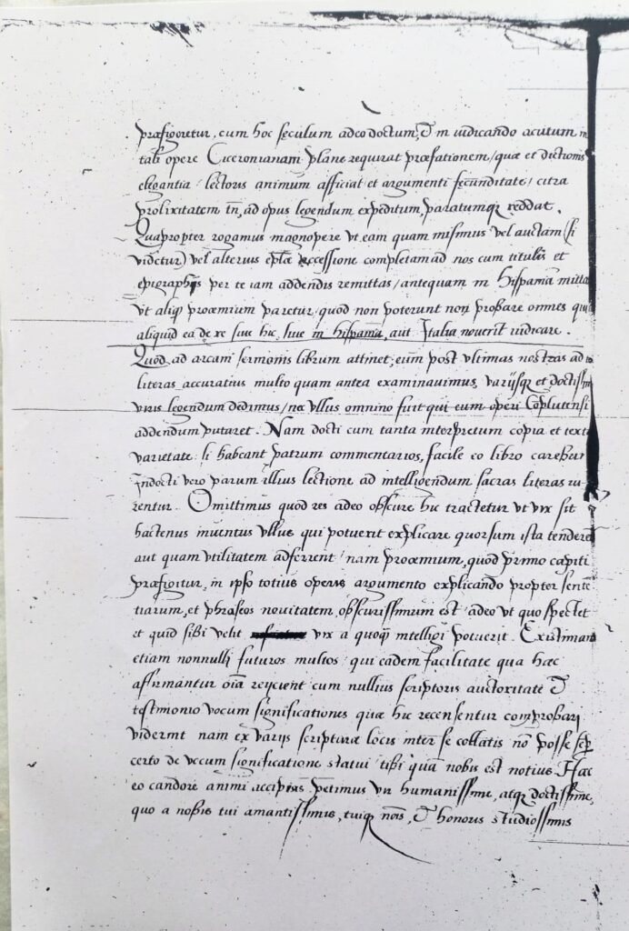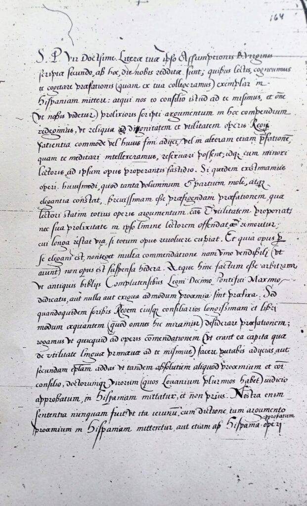[1] Vir doctissime, literae tuae ipso Assumptionis Beatae Virginis scriptae secundo ab hoc die nobis redditae sunt; quibus lectis, cognouimus te cogitare praefationis (quam ex tua collegeramus) exemplar in Hispaniam mittere. Atqui nos eo consilio istud ad te misimus, et omne (ut nobis uidetur) prolixioris scripti argumentum in hoc compendium redegimus, ut reliqua ad dingnitatem et utilitatem operis regii facientia commode uel huius fini adiici, uel in alteram etiam praefationem, quam te meditari intellexeramus, reseruari possent; idque cum minori lectoris ad ipsum opus properantis fastidio. [2] Si quidem existimamus operi huiusmodi, quod tanta uoluminum et partium mole atque elegantia constat, breuissimam esse praefigendam praefationem, quae lectori statim totius operis argumentum, causas et utilitatem proponat nec sua prolixitate in ipso limine lectorem offendat aut remoretur, cui longa restat uia, si totum opus reuoluere cupiat. Et quia opus per se elegans est, non eget multa commendatione; nam uino uendibili (ut aiunt) non opus est suspensa hedera. Atque hinc factum esse arbitramrarbitramur ut antiquis Bibliis Complutensibus, Leoni Decimo Pontifici Maximo dedicatis, aut nulla aut exigua admodum prooemia sint praefixa. [3] Sed quandoquidem scribis regem eiusque consiliarios longissimam et libri modum aequantem (quod omnes hic miramur) desiderare praefationem, rogamus ut quicquid ad operis commendationem (ut erant ea capita quae de utilitate linguae primaeuae ad te misimus) facere putabis adiicias, aut secundam epistulam addas ut tandem absolutum aliquod prooemium et communi consilio doctorumque uirorum (quos Louanium plurimos habet) iudicio approbatum in Hispaniam mittatur, et non prius. Nostra enim sententia nunquam fuit ut ita ieiunum cum dictione tum argumento prooemium in Hispaniam mitteretur, aut etiam ab Hispania approbatum operi [f. 164v] praefigeretur, cum hoc saeculum adeo doctum et in iudicando acutum in tali opere ciceronianam plane requirat praefationem, quae et dictionis elegantia lectoris animum afficiat et argumenti faecunditate1, citra prolixitatem tamen, ad opus legendum expeditum paratumque reddat. [4] Quapropter2 rogamus magnopere ut eam quam misimus uel auctam (si uidetur) uel alterius epistulae accessione completam ad nos cum titulis et epigraphis per te iam addendis remittas, antequam in Hispaniam mittatur, ut aliquod prooemium paretur; quod non poterunt non probare omnes qui aliquid ea de re siue hic siue in Hispania aut Italia nouerint iudicare.