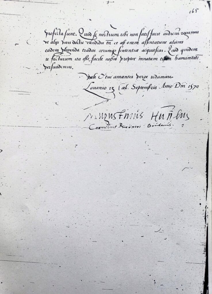 [7] Haec eo candore animi accipias petimus, uir humanissime atque doctissime, quo a nobis, tui amantissimis tuique nominis et honoris studiossimisstudiosissimis, [f. 165r] profecta sunt. [8] Quod si nostrum tibi non satisfacit iudicium, rogamus ut aliis uiris doctis, candidis tamen et ab omni assentatione alienis eadem perlegenda tradas eorumque sententiae acquiescas. Quod quidem te facturum ita esse, facile nobis propter innatam tuam humanitatem persuademus.
