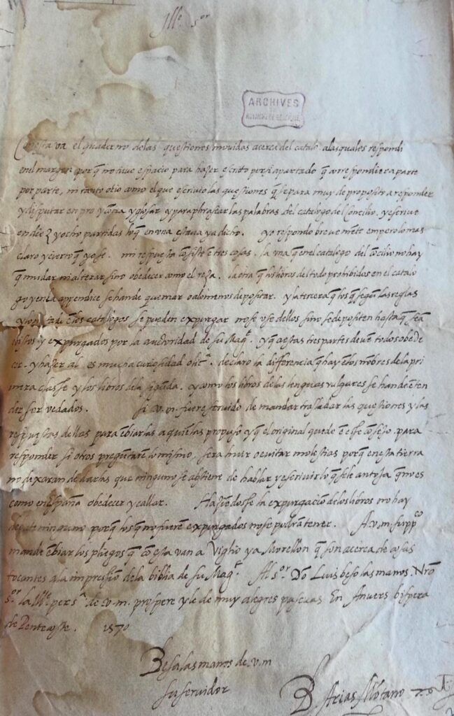 [5] A vuestra merced supplico mande embiar los pliegos que con esta van a Viglio y a Morellon, que son acerca de cosas tocantes a la impressión de la Biblia de Su Magestad. [6] Al señor don Luis beso las manos.
