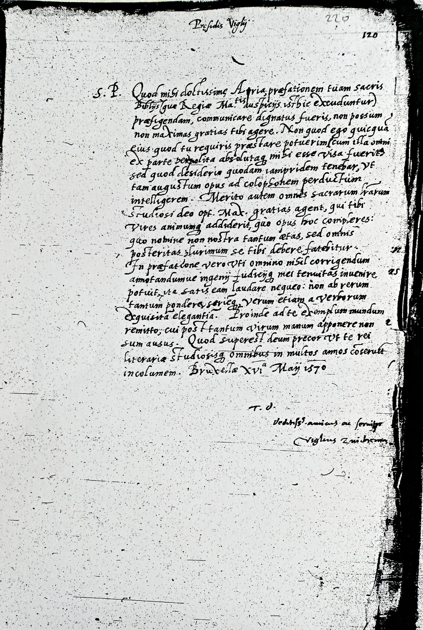 [1] Quod mihi, doctissime Aria, praefationem tuam Sacris Bibliis (quae Regiae Maiestatis auspiciis isthic excuduntur) praefigendam communicare dignatus fueris, non possum non maximas gratias tibi agere.1 Non quod ego quicquam eius quod tu requiris praestare potuerim, cum illa omni ex parte perpolita absolutaque mihi esse uisa fuerit, sed quod desiderio quodam iampridem tenebar ut tam augustum opus ad colophonem perductum intelligerem. [2] Merito autem omnes Sacrarum Literarum studiosi Deo Optimo Maximo gratias agent, qui tibi uires animumque addiderit quo opus hoc compleres; quo nomine non nostra tantum aetas, sed omnis posteritas plurimum se tibi debere fatebitur.